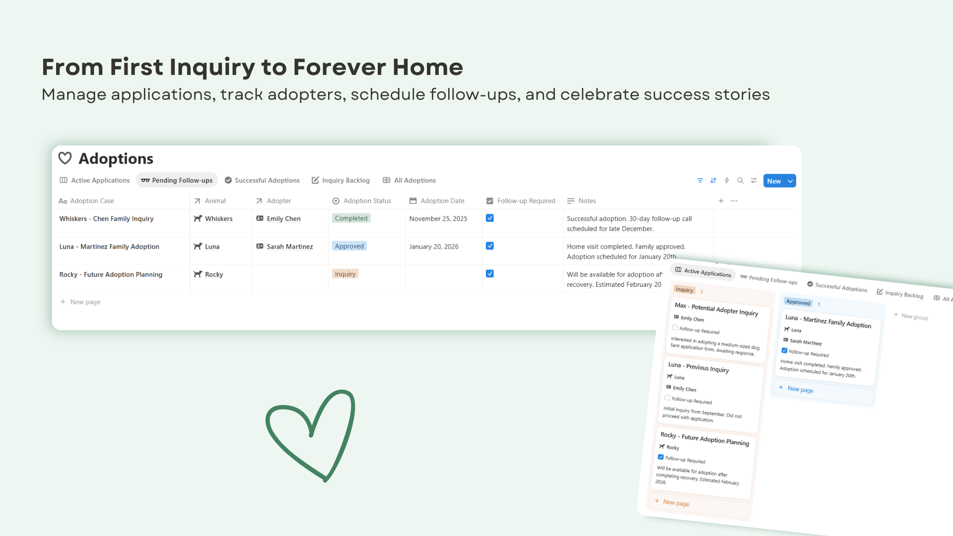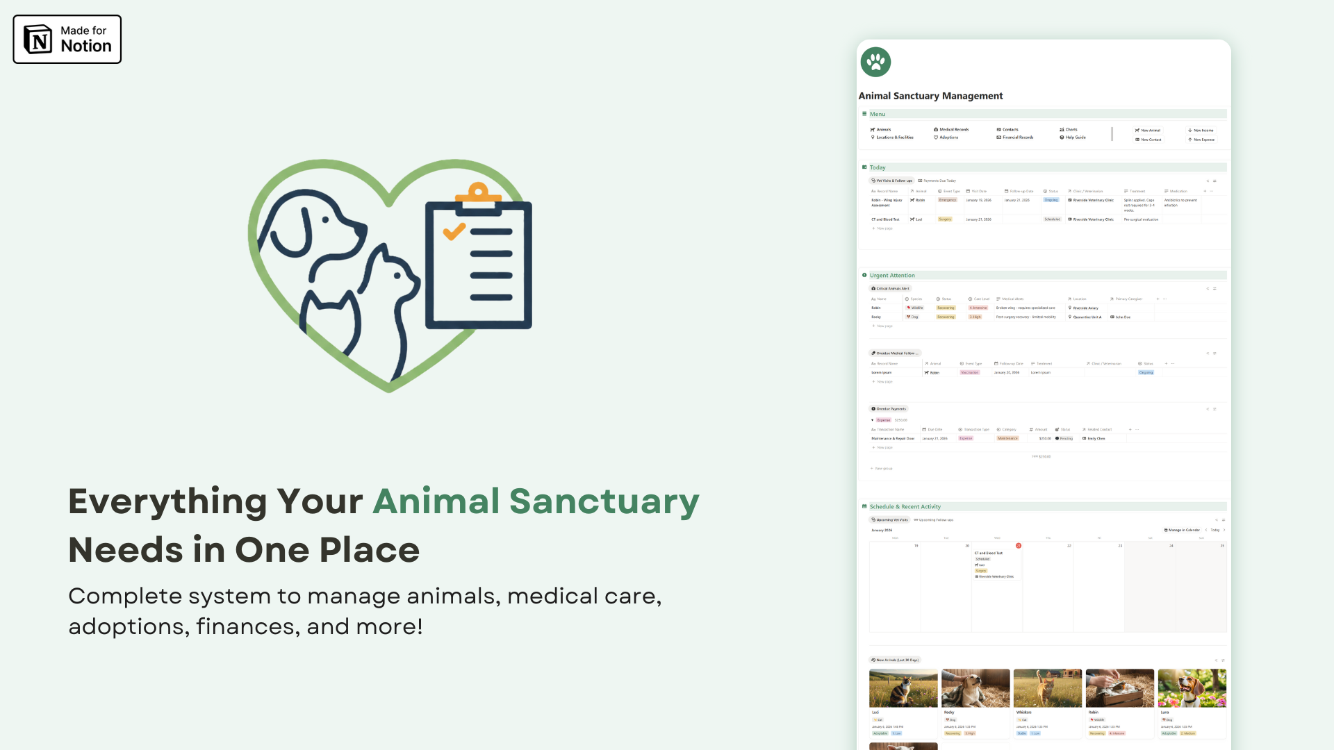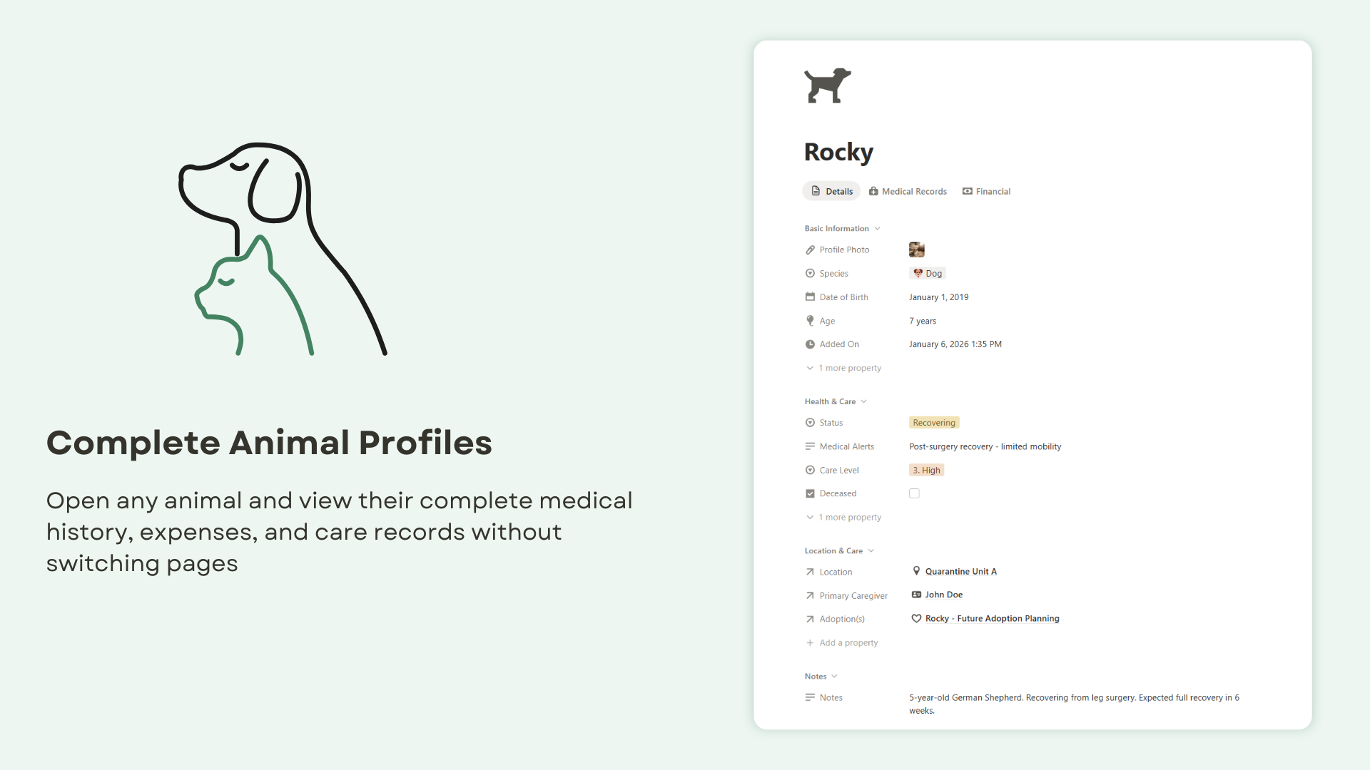 Streamline animal care, medical records, adoptions, and finances in one powerful Notion workspace. Built specifically for animal sanctuaries, rescue shelters, and foster networks.
