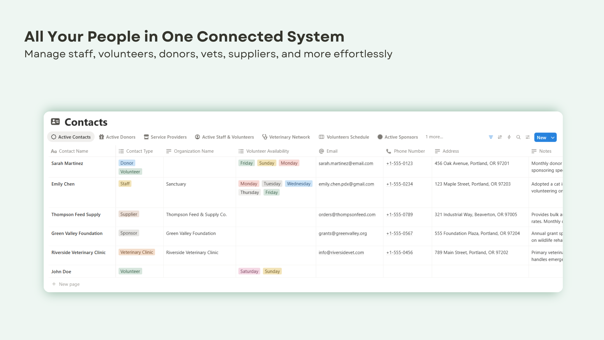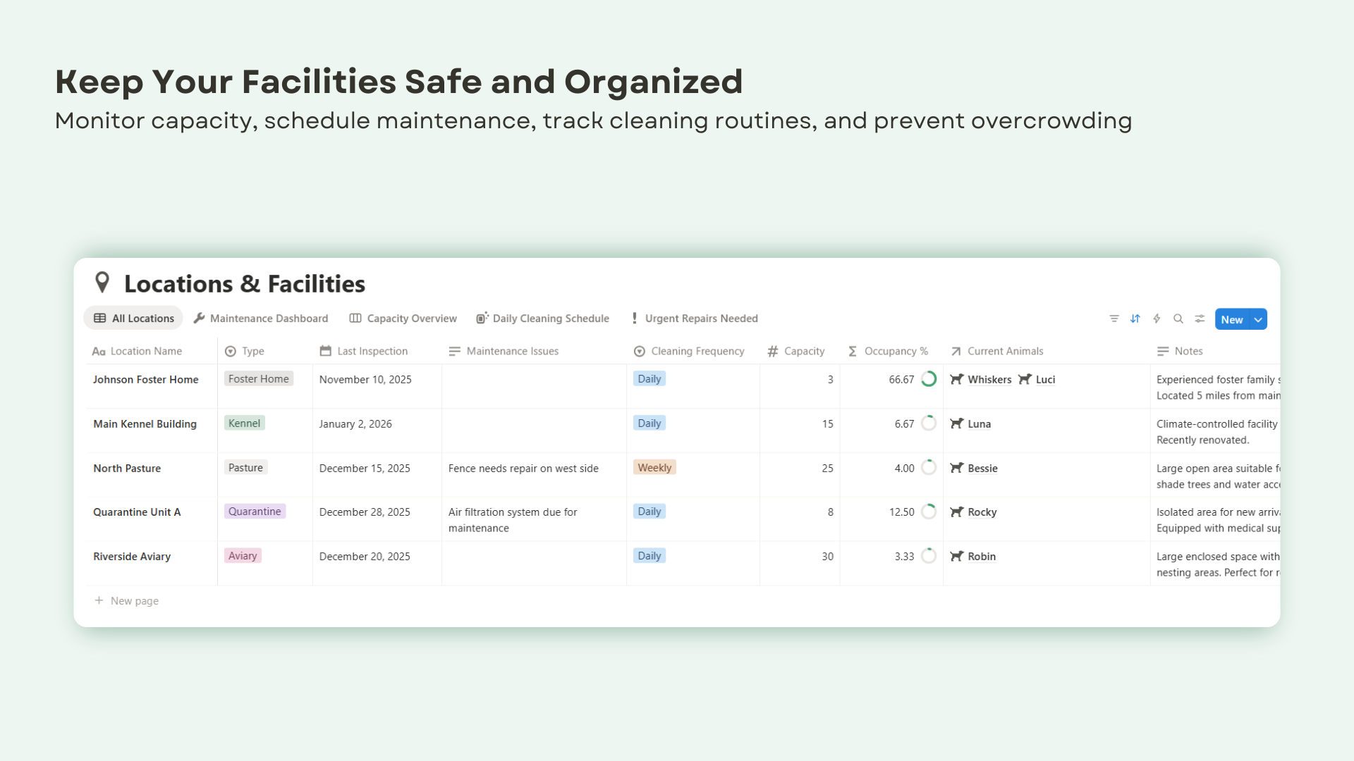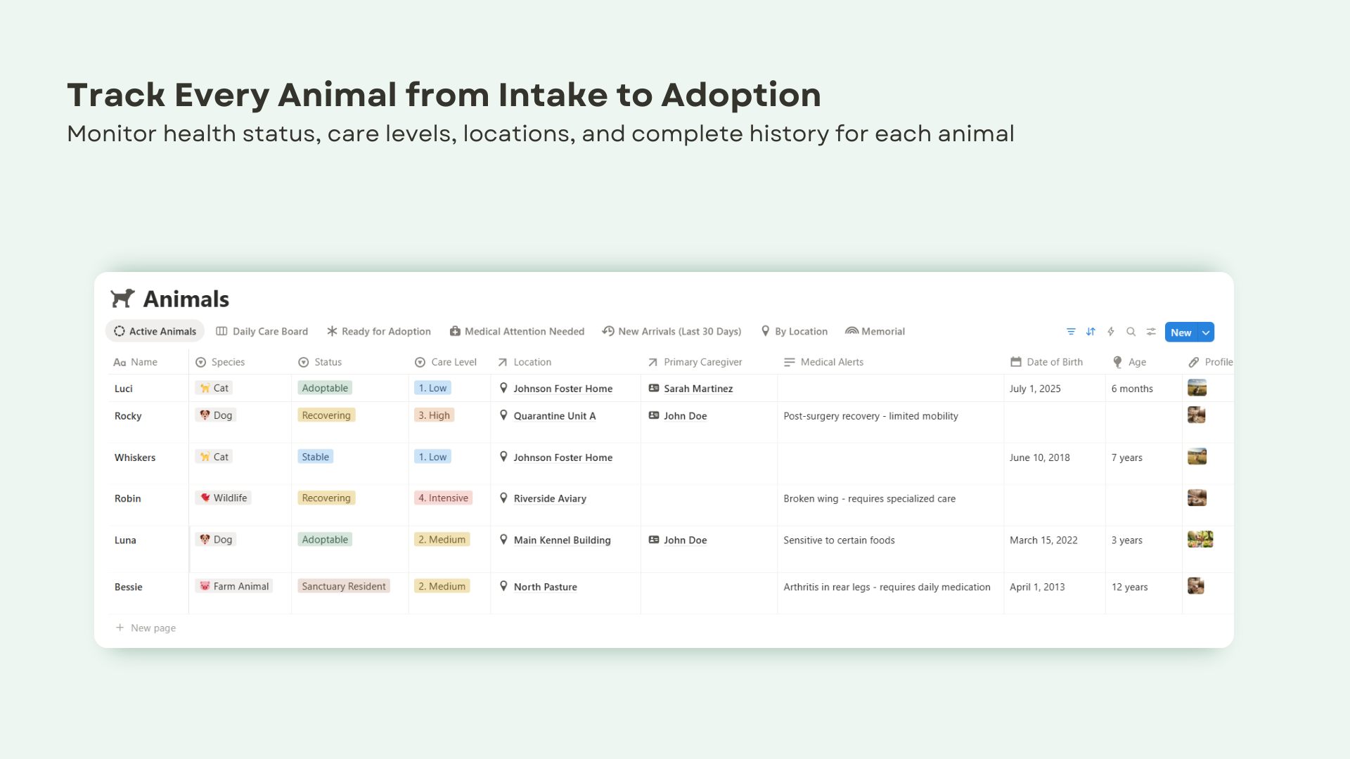 Whether you're managing 10 animals or 100, running a small rescue or a large sanctuary, this template scales with your needs. It's designed by understanding real sanctuary workflows, and it includes smart automations, intuitive dashboards, and powerful databases that make daily operations seamless.