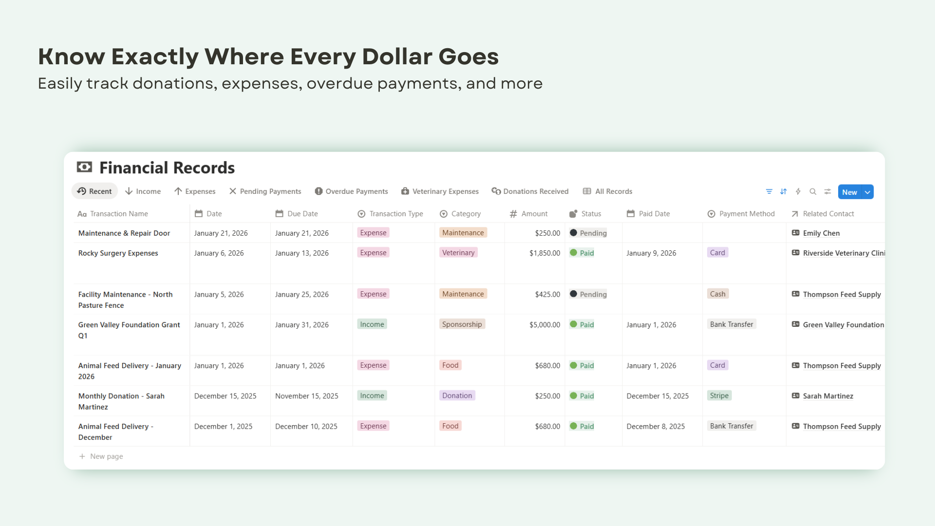 - View all linked records at a glance: See each contact's related animals, adoption applications, and financial transactions directly from their contact page with connected database views.