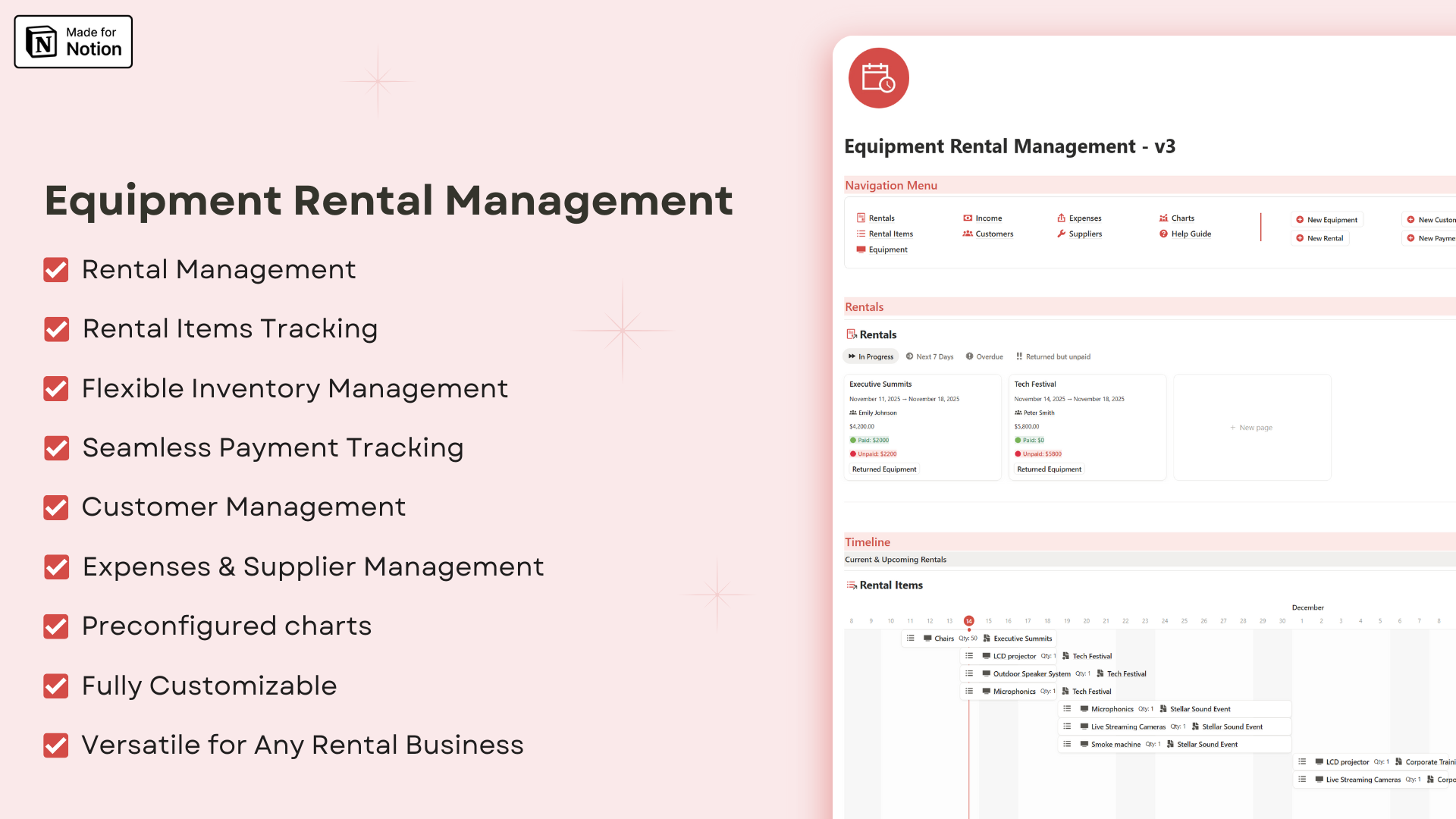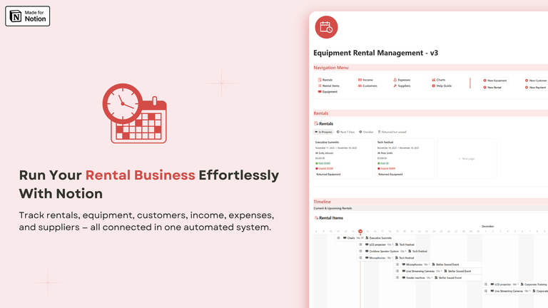 - All-in-One Hub: Rentals, inventory, payments, clients — centralized in Notion.