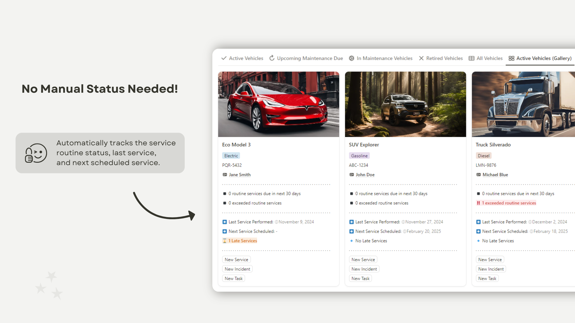 - Vehicles Database: The central hub for managing all your vehicles, including details like status, mileage, insurance, and service history.