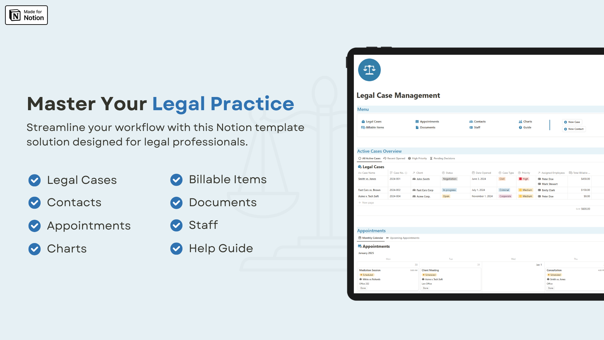Centralize your law practice in one Notion template. Track cases, clients, staff, documents, appointments, and billable items with an easy-to-use, customizable system Perfect for law firms and legal professionals.