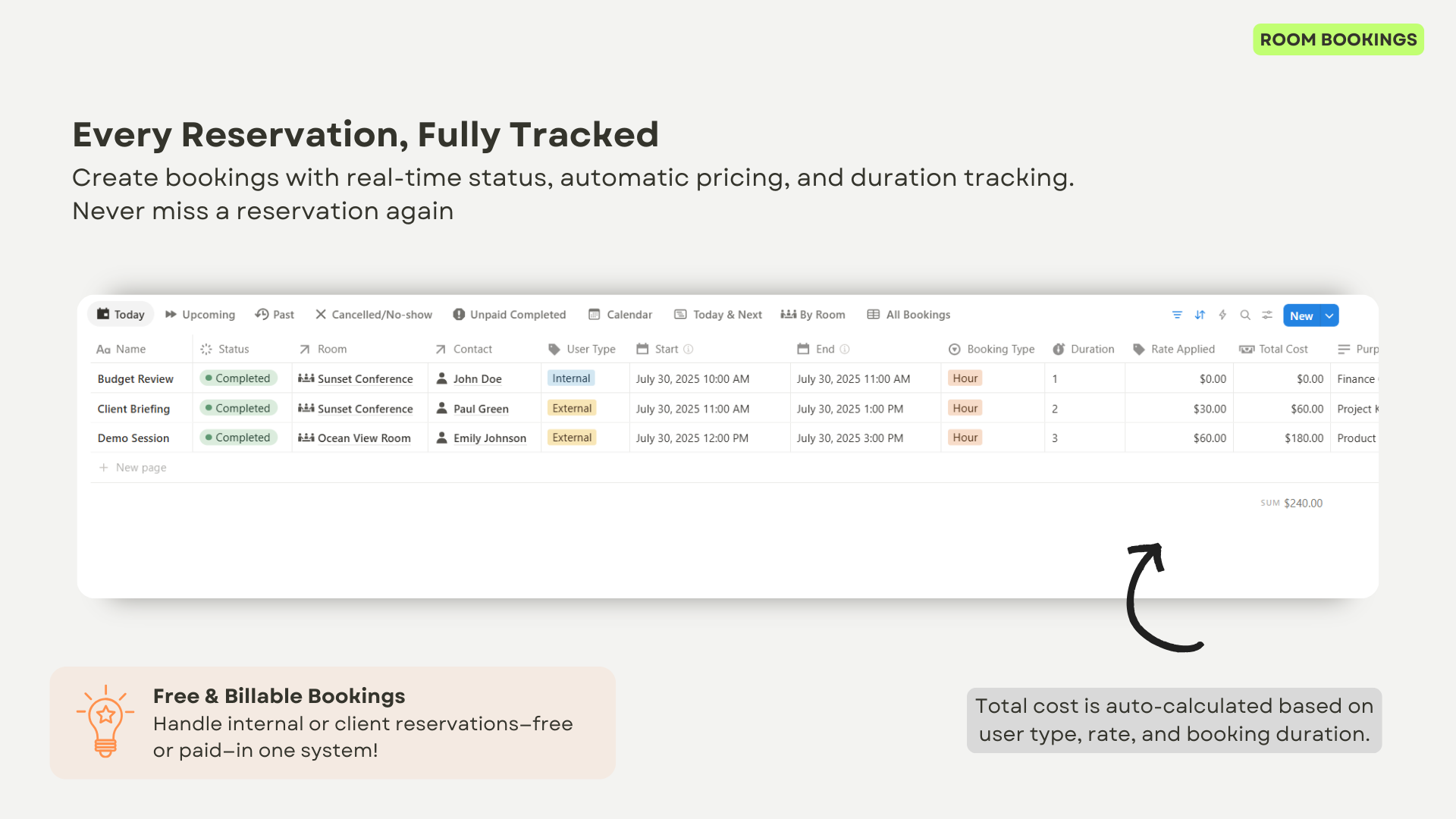 Perfect for internal or client bookings — track reservations, availability, and payments in one simple system.