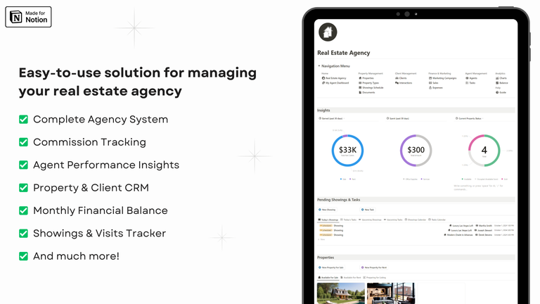 A complete Real Estate Agency CRM and financial management system built in Notion. Track properties, clients, agents, sales, commissions, expenses, showings, interactions, documents, marketing campaigns, tasks, and monthly balance. Includes dashboards and performance charts for data-driven decisions.